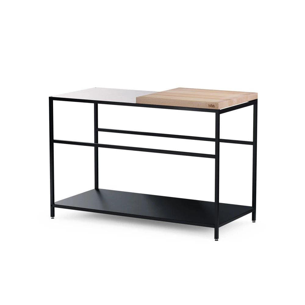 - 2 étagères : étagère noire pour le bas et étagère en acier amovible