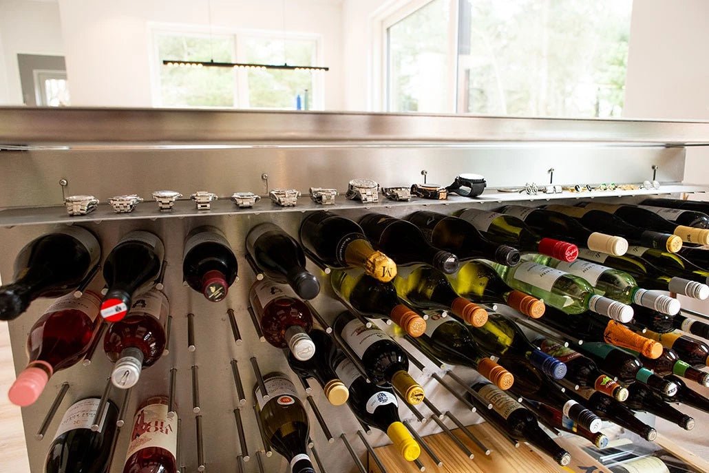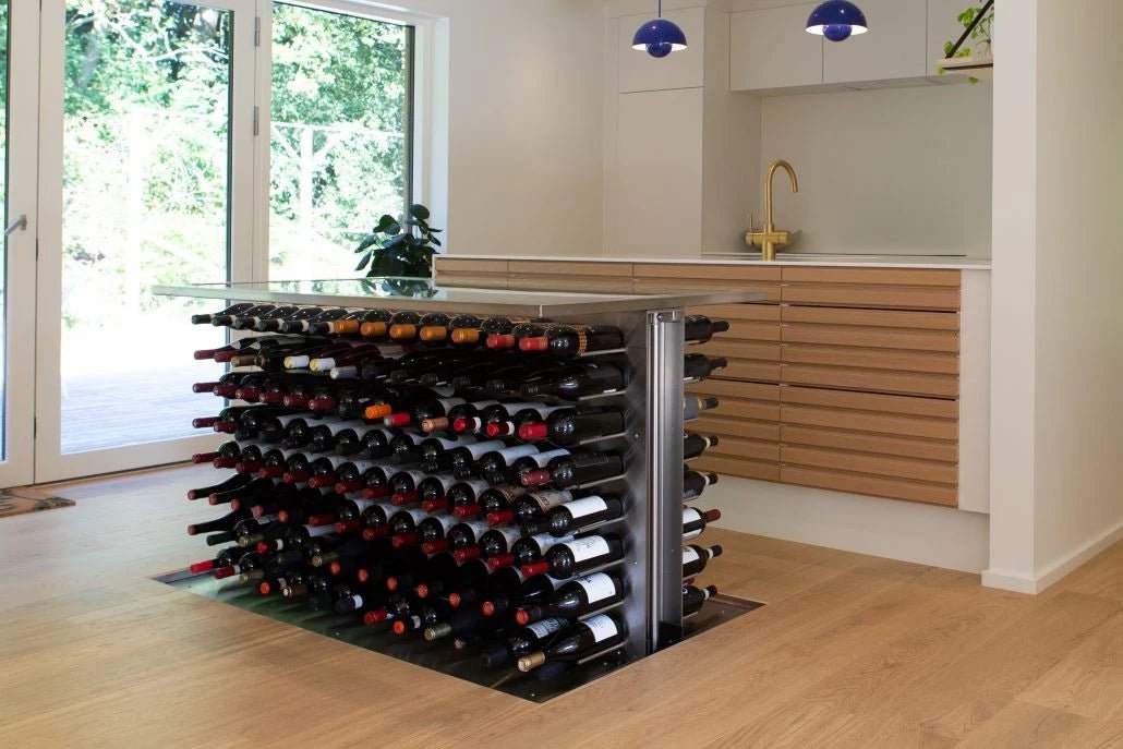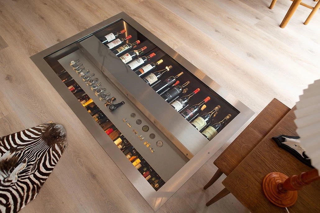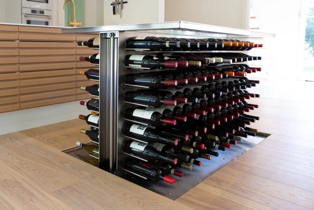 Une cave à vin encastrée avec élévation. Vinorage a conçu une cave à vin unique en son genre, équipée d’un moteur électrique qui peut être encastrée dans le sol et remontée selon vos envies. Cette cave à vin avec élévation a une capacité de 200 bouteilles.