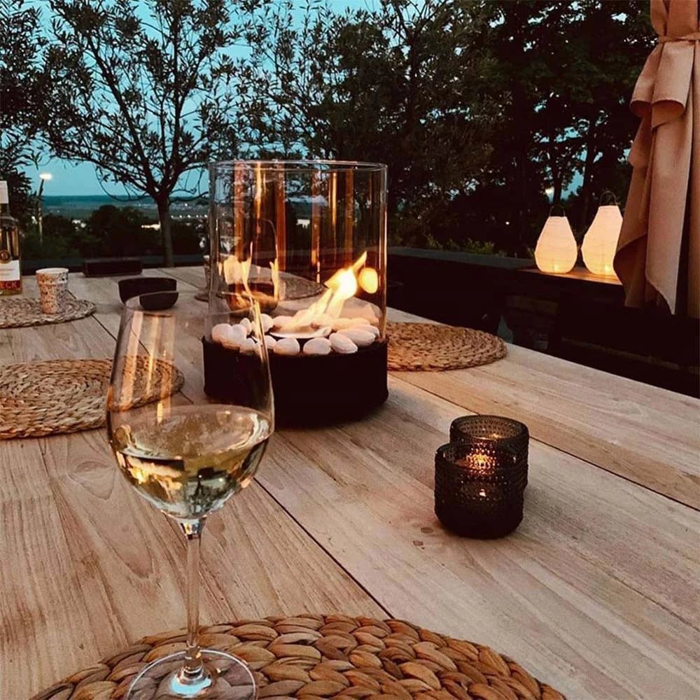 Le socle noir est en acier inoxydable et le cylindre en verre amovible garantit une construction de haute qualité. La combustion du bioéthanol assure une combustion propre, et n’émet ni suie ni cendre. Le foyer ne nécessite donc que très peu d’entretien et de nettoyage.
