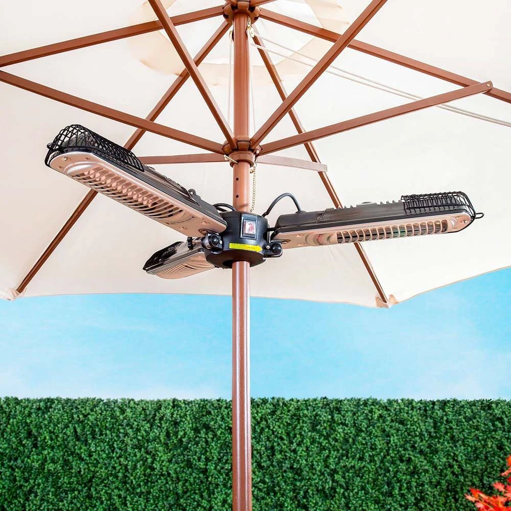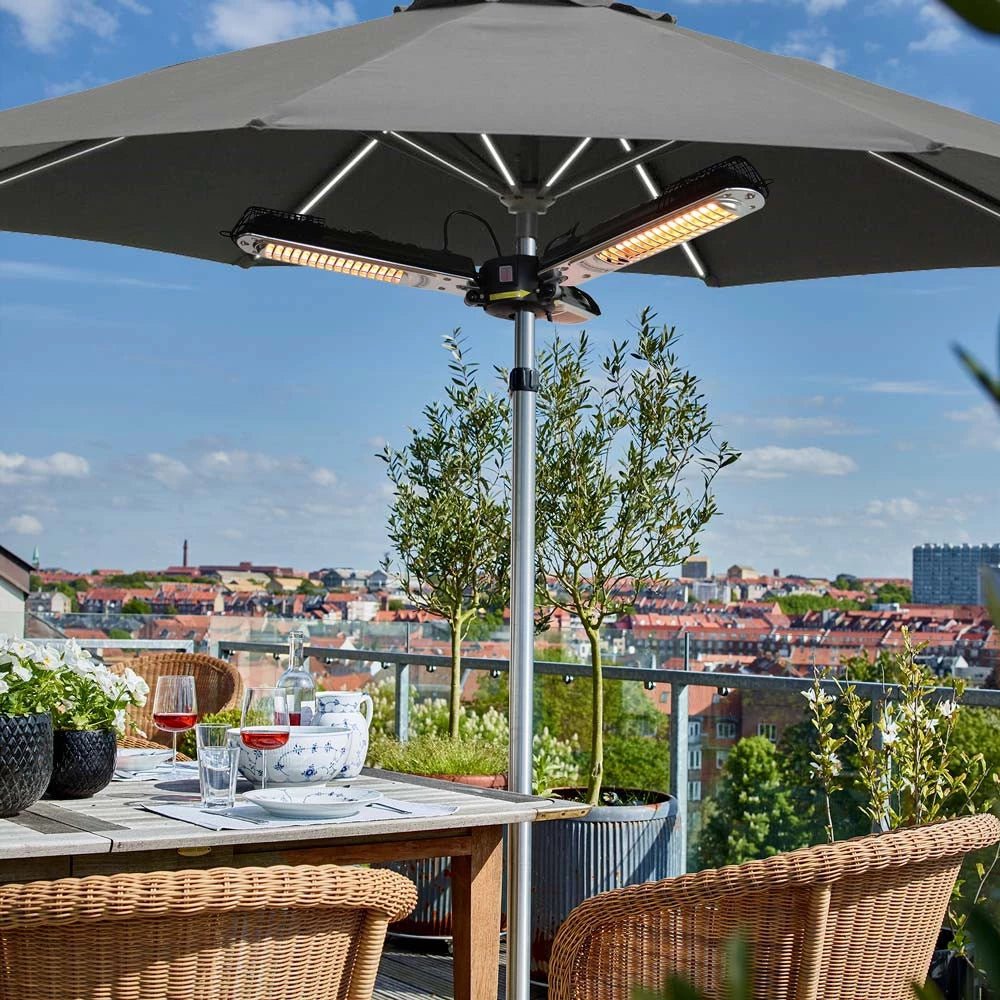Chauffe terrasse noir Hortus parfait pour être monté sur un parasol. Il est composé de 3 radiateurs pouvant être utilisés individuellement. Il est conçu pour réchauffer des espaces de 4-5m². Le design a été fait de façon à ce que vous n’ayez pas besoin de retirer le parasol du support et ainsi faciliter le montage. Le revêtement des radiateurs est également fabriqué pour éviter d’endommager le parasol.