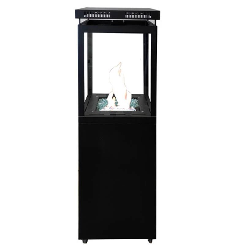 Foyer à gaz noir indépendant, idéal pour créer une ambiance chaleureuse sur la terrasse, le balcon ou dans le jardin. Le foyer est en acier et conçu avec 4 côtés en verre, ce qui vous permet de voir les belles flammes de tous les côtés.