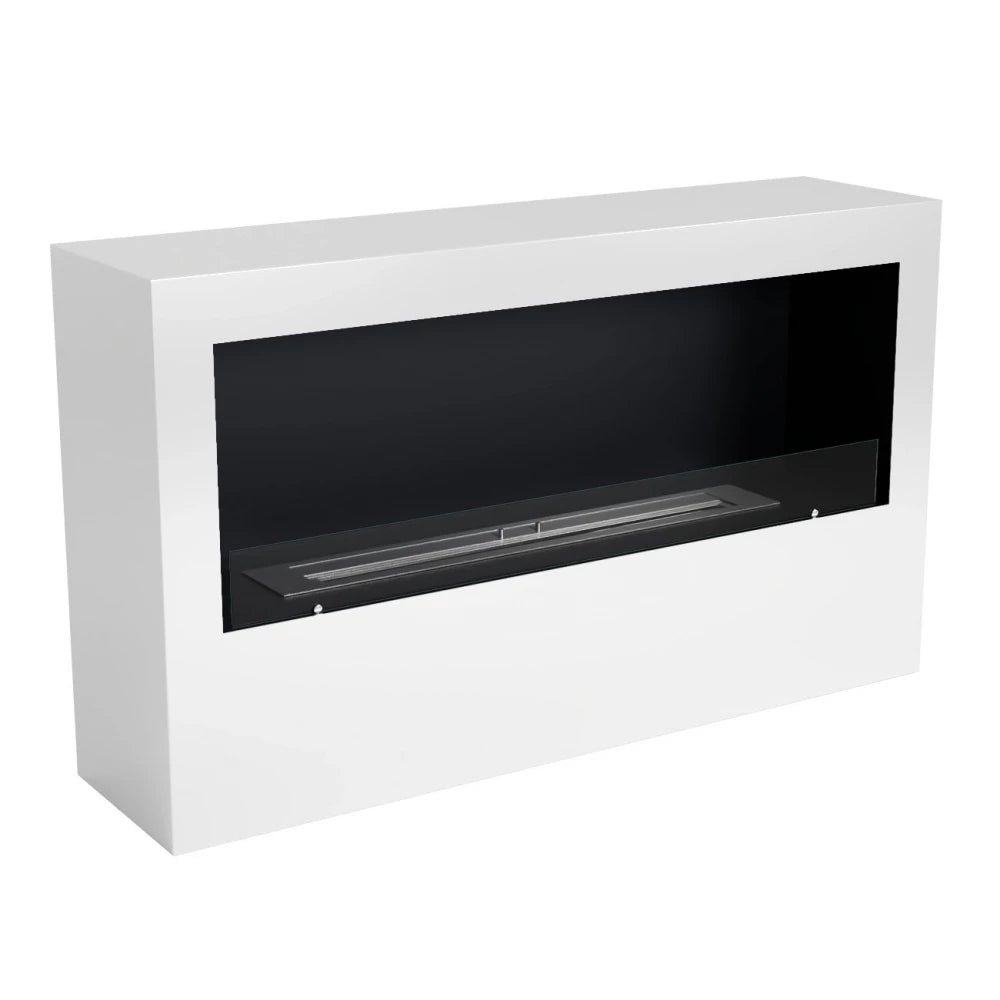 Cheminée à l’éthanol élégante pouvant être encastrée dans le mur ou simplement posée au sol. Vous pouvez par exemple l’utiliser en tant que séparateur de pièce. Cette cheminée offre une superbe vue sur les flammes grâce au contraste entre le blanc, le noir et la couleur orange des flammes. Elle s’intégrera facilement dans toutes les maisons. De plus, le verre de sécurité la rend pratique pour les familles avec enfants et/ou animaux de compagnie.