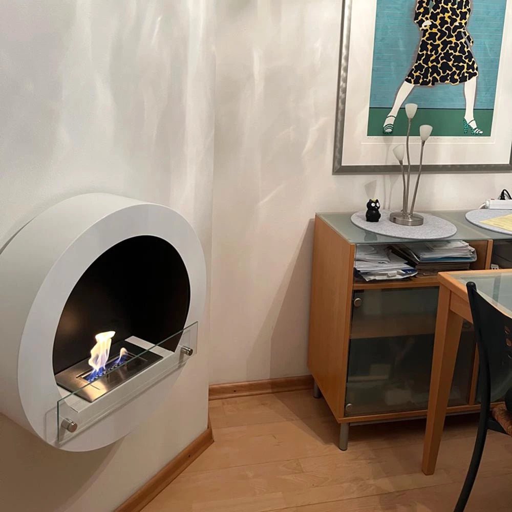 Cheminée murale ronde et blanche au bioéthanol