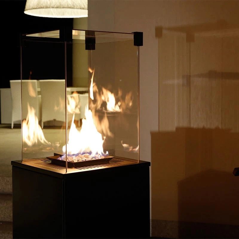 La cheminée est alimentée par un gaz liquide provenant d’une bouteille. Les flammes sont scellées à l’intérieur d’une cellule en verre, ce qui garantit que vous n’êtes jamais en contact direct avec le feu. La cheminée à gaz est conçue pour distribuer la chaleur dans quatre directions. Elle est équipée d’une soupape de direction spéciale qui, en cas de renversement de l’appareil, coupe l’alimentation en gaz du contrôleur.