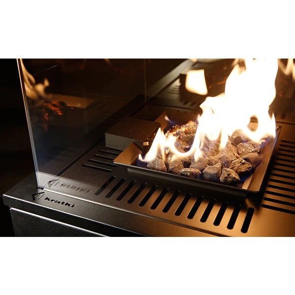 La cheminée est alimentée par un gaz liquide provenant d’une bouteille. Les flammes sont scellées à l’intérieur d’une cellule en verre, ce qui garantit que vous n’êtes jamais en contact direct avec le feu. La cheminée à gaz est conçue pour distribuer la chaleur dans quatre directions. Elle est équipée d’une soupape de direction spéciale qui, en cas de renversement de l’appareil, coupe l’alimentation en gaz du contrôleur.