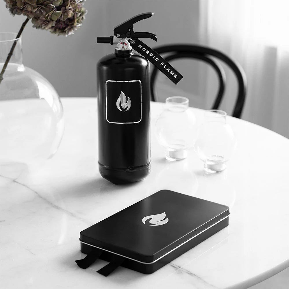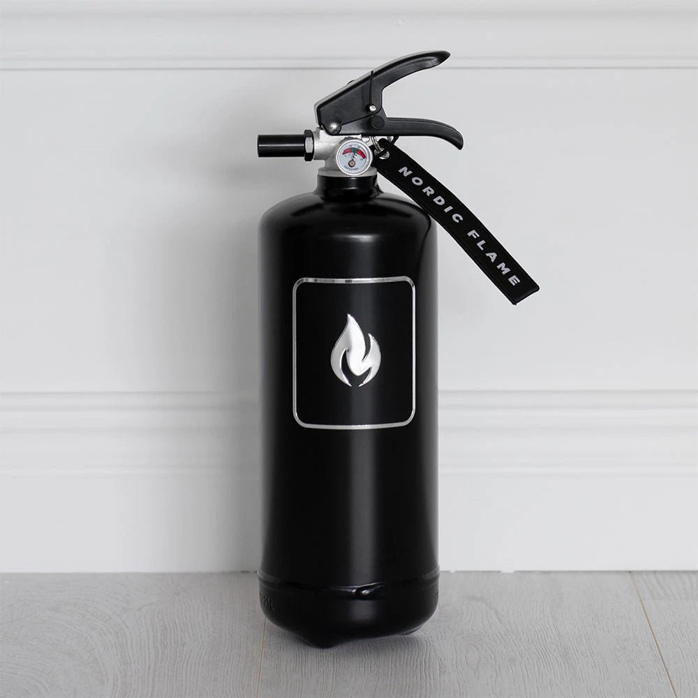 Superbe extincteur noir de 2 kg avec une finition élégante comprenant le logo Nordic Flame métallique imprimé sur le devant du produit. Conçu pour s’intégrer parfaitement dans un décor intérieur moderne.