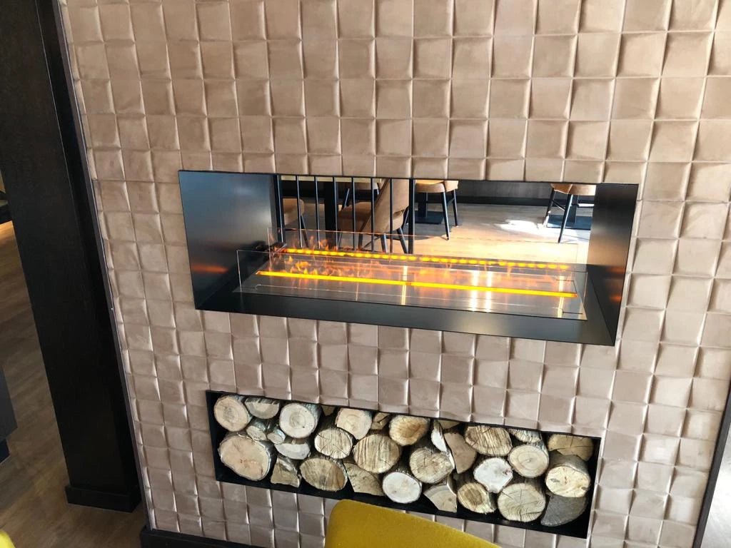 Cheminée minimaliste qui crée une flamme via de la vapeur d’eau et des lumières LED. Le Foco Two est une cheminée hybride tunnel, ouverte sur deux côtés. Elle peut donc séparer une pièce avec une flamme visible depuis deux pièces.