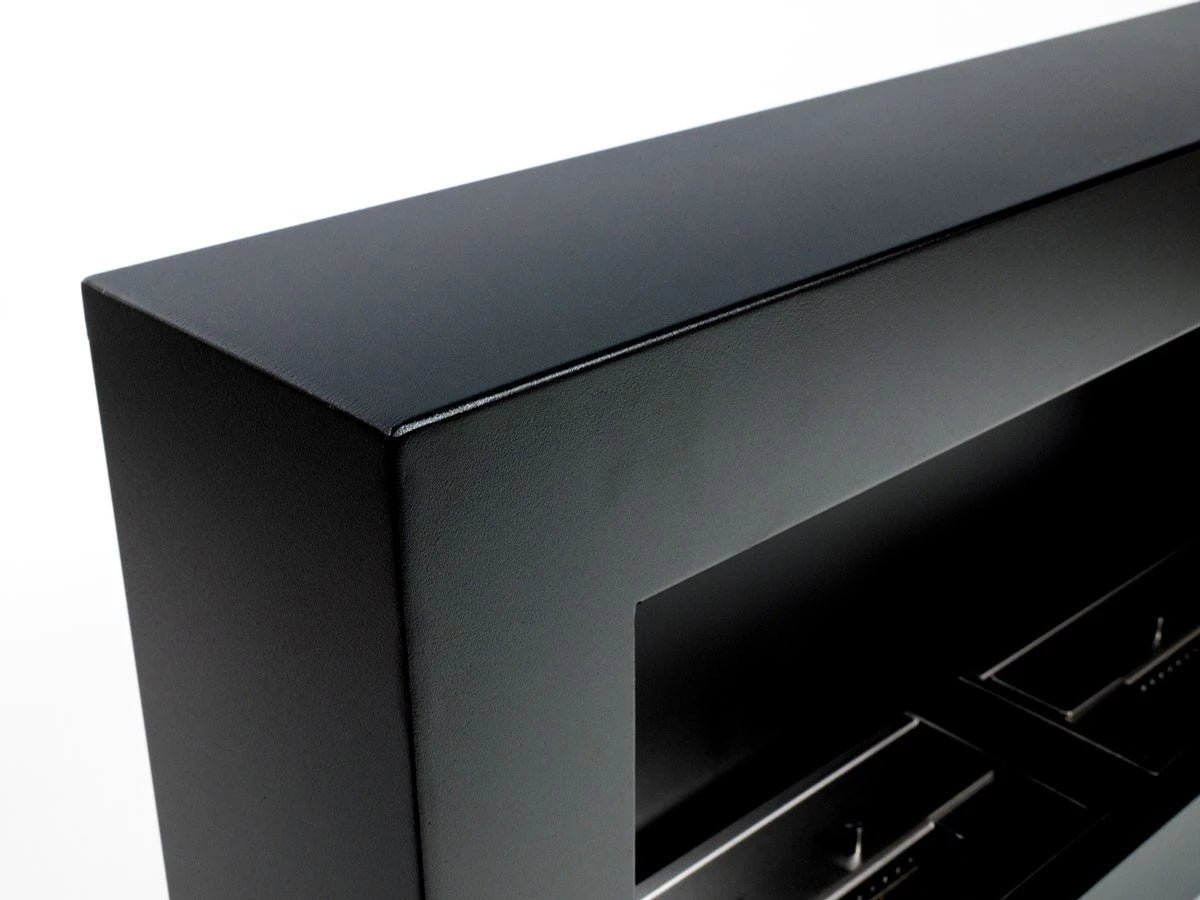 Belle cheminée élégante avec cadre noir. S’intègre très bien dans un style minimaliste avec un design « angulaire ». La cheminée est conçue pour avoir deux brûleurs et est entièrement ouverte au feu. Elle est intemporelle et élégante dans sa couleur noire et se fond naturellement dans son environnement. Conçue dans la forme carrée et les bords tranchants font un bel équilibre sont un grand complément au feu naturel. La plaque est choisie en noir car la couleur rend le regard plus puissant et la flamme gagne en profondeur. Le nettoyage et l’entretien sont faciles car il ne produit pas de suie, de fumée ou de cendres.