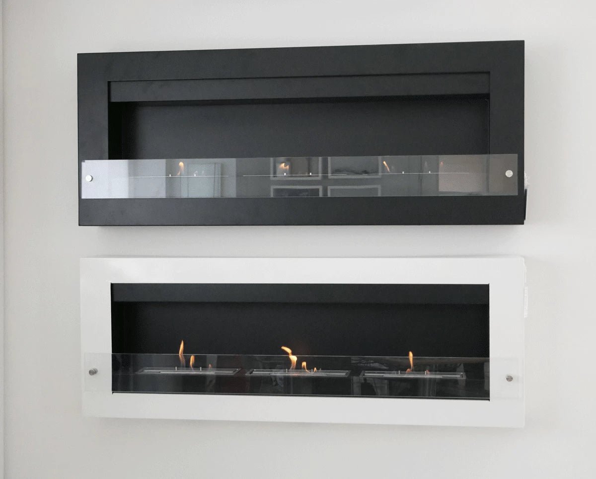 Grande cheminée murale noire avec une plaque de verre