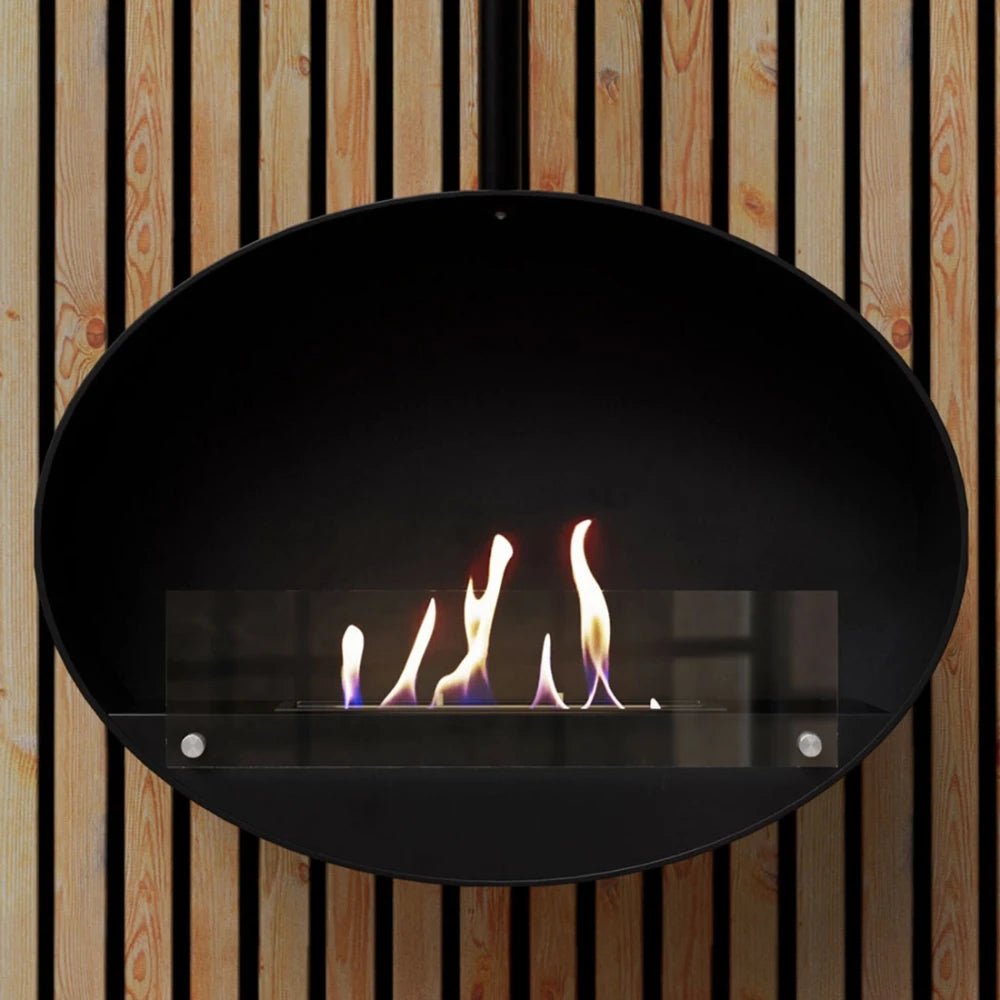 Halifax est une cheminée bio suspendue ovale avec un réservoir de bioéthanol de 2,0 litres, offrant une autonomie de combustion allant jusqu’à 7 heures par remplissage.