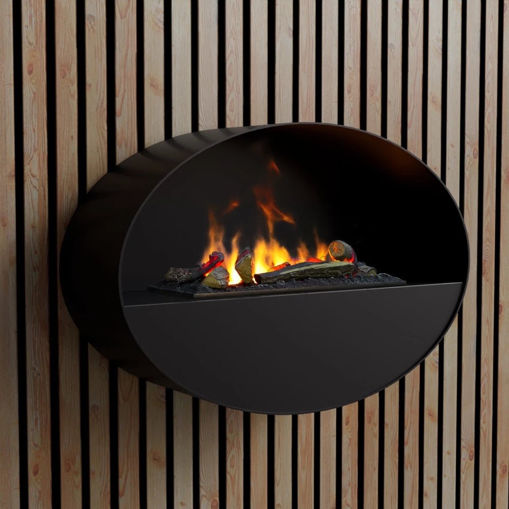 ScandiFlames Electric Kjos a un design rond avec une vue sur la flamme depuis l’avant.