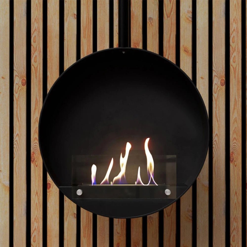 Ottawa est une cheminée bio suspendue ronde avec un réservoir de 1,5 litre de biothanol, offrant une autonomie de combustion allant jusqu’à 6 heures par remplissage.