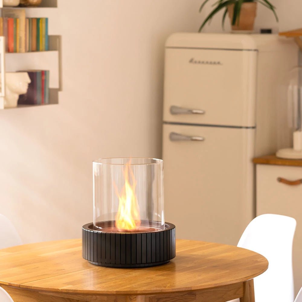 Le grand cylindre en verre protège la cheminée des courants d’air et des petites rafales de vent. Ainsi, elle est idéale pour un usage extérieur, notamment sur une terrasse, et à l’intérieur.