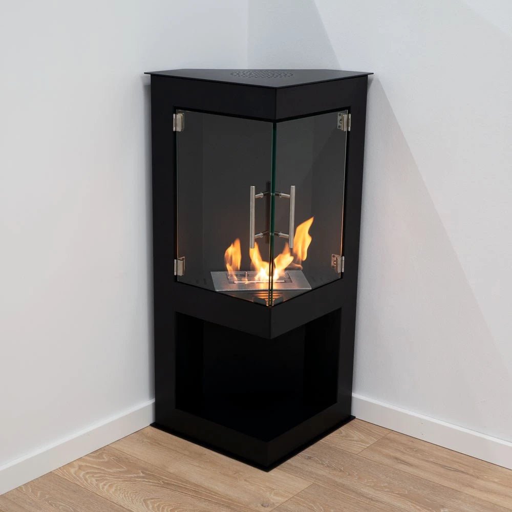 Ce poêle au bioéthanol a un design traditionnel de poêle à bois mais sans les inconvénients d’entretien et est plus écologique. Le design est parfait pour être posé dans un coin, où les flammes peuvent être appréciées de deux côtés différents, à travers les portes en verre. À l’arrière du foyer, il y a de l’espace pour que l’air puisse entrer et sortir du foyer.