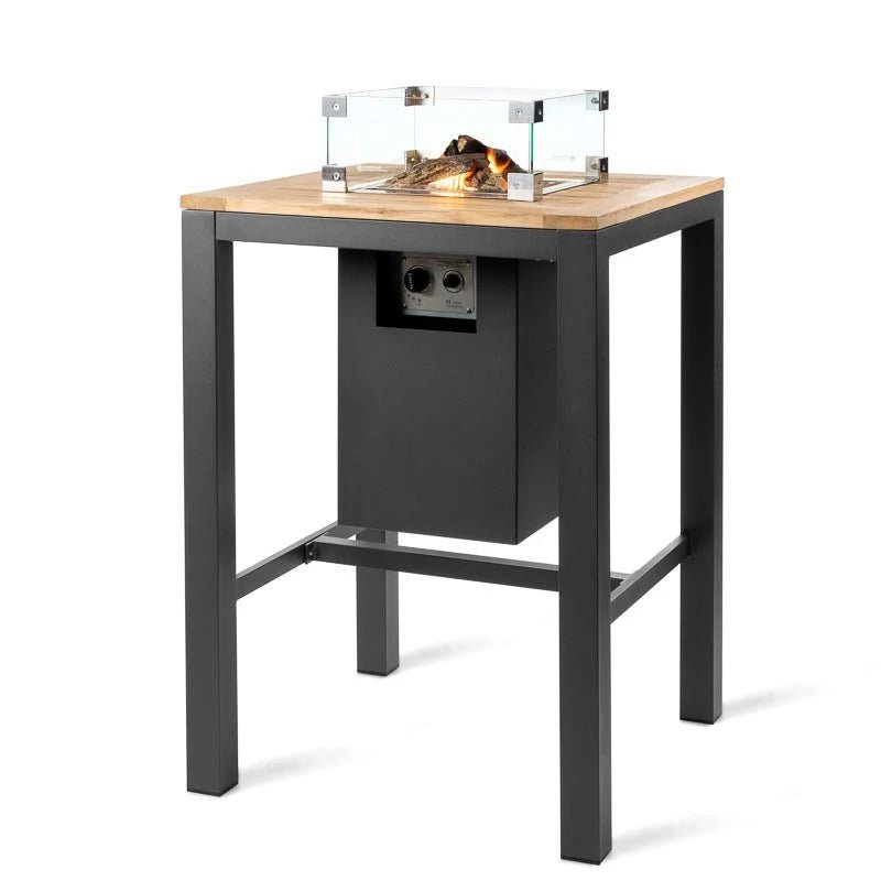 Table de jardin type bar de la marque Happy Cocooning en alluminium de couleur anthracite et plateau en teck. Cette table est pourvue d’un brûleur fonctionnant au gaz et procurant une puissance de chaleur de 6,5 kW. La hauteur des flammes est réglable.
